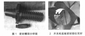 10kV高壓充氣柜運轉一段時間后,低氣壓報警發起,斷路器氣室壓力下降,經SF氣體檢漏儀檢測為穿墻套管部分漏氣,拆開穿墻套管后發現密封槽部分碎裂,如圖1所示,開關柜底板密封部位完好,如圖2所示。