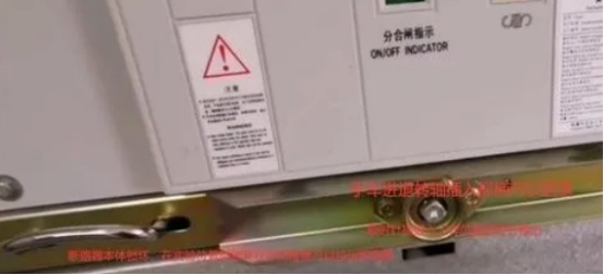 6,上圖為斷路器本體鎖環(huán),圖中為斷路器試驗(yàn)方位,從檢修方位推入試驗(yàn)方位時(shí),把兩頭鎖環(huán)往中心推把鎖環(huán)翻開,推入到試驗(yàn)方位時(shí),松開鎖環(huán)鎖環(huán)就翻開鎖在試驗(yàn)方位,當(dāng)要從試驗(yàn)方位推入到工作方位時(shí),將兩頭鎖環(huán)往中心推翻開鎖環(huán),這時(shí)順時(shí)針搖入斷路器到工作方位。