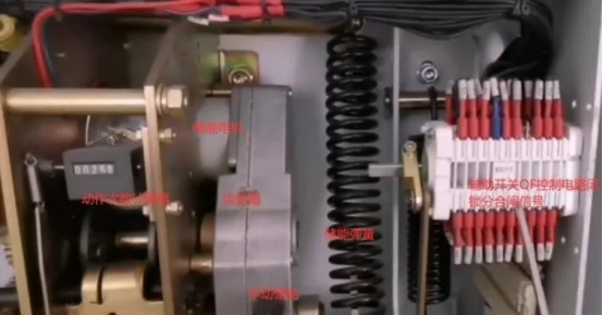 1,斷路器在分閘已儲能狀況,儲能指示顯現(xiàn)已儲能,儲能繃簧已擺開,面板得合閘按鈕在上圖中的下孔中,假如斷路器未儲能是合不了閘的