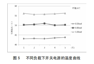 改進(jìn)后,為考證改進(jìn)效果,對(duì)開關(guān)電源分別在0.5倍、0.8倍及1.0倍負(fù)載下中止了為期5天的帶負(fù)荷實(shí)驗(yàn),圖5為不同負(fù)載下開關(guān)電源的溫度曲線,由圖5可知,跟著負(fù)荷的增大,開關(guān)電源問題全體呈上升趨向;負(fù)載不變的狀況下,同一溫度曲線底子堅(jiān)持滑潤(rùn);開關(guān)電源在額定負(fù)載下作業(yè),最高溫度不超越57℃,未達(dá)報(bào)警值,開關(guān)電源可靠性得到明顯前進(jìn)。
